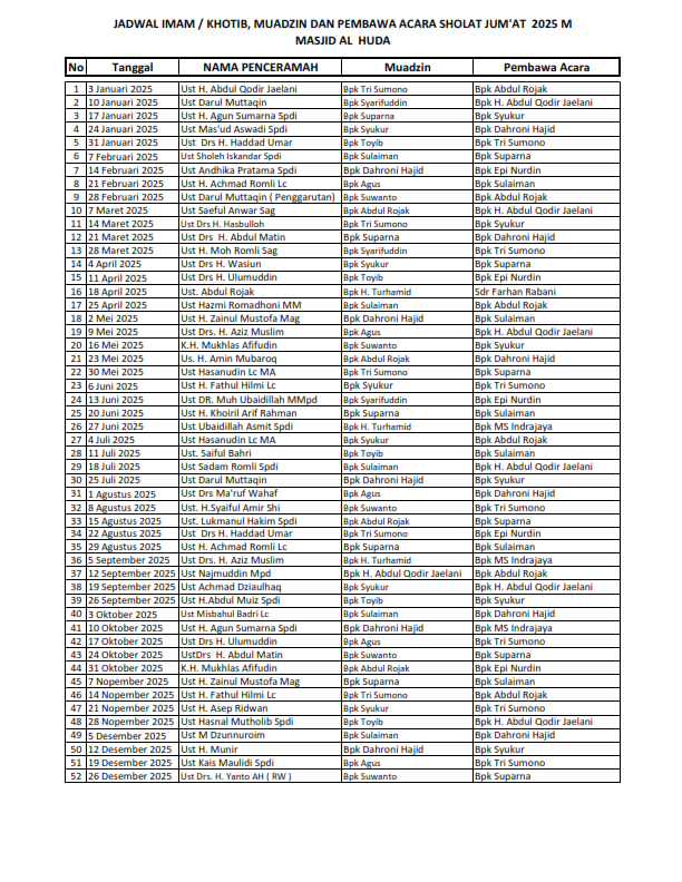 Posted inPetugas Jumat Jadwal Petugas Jum’at Tahun 2025 Posted by By H Kirno Sukirno Desember 11, 2024 H Kirno Sukirno View All Posts Post navigation Previous Post Laporan Jum’at Bulan Desember 2024Next PostJadwal Imam dan Khotib Sholat Jum’at Tahun 2024