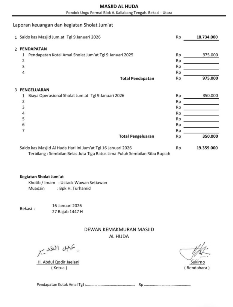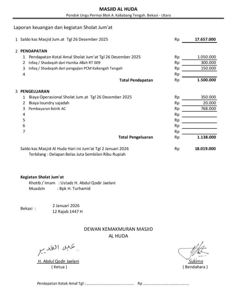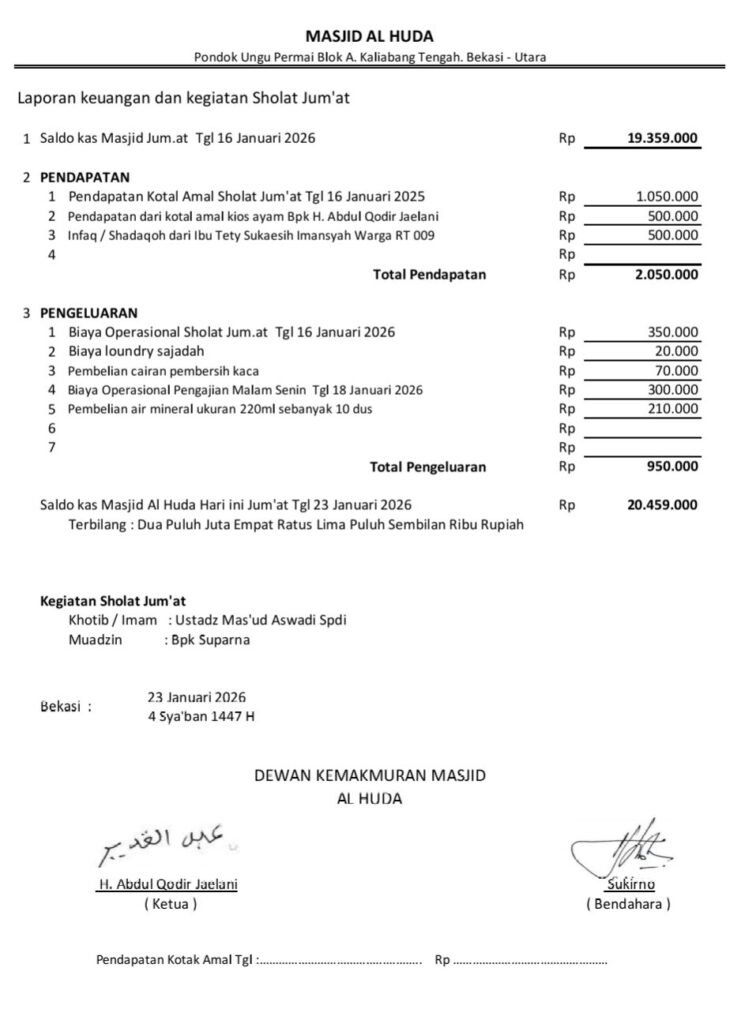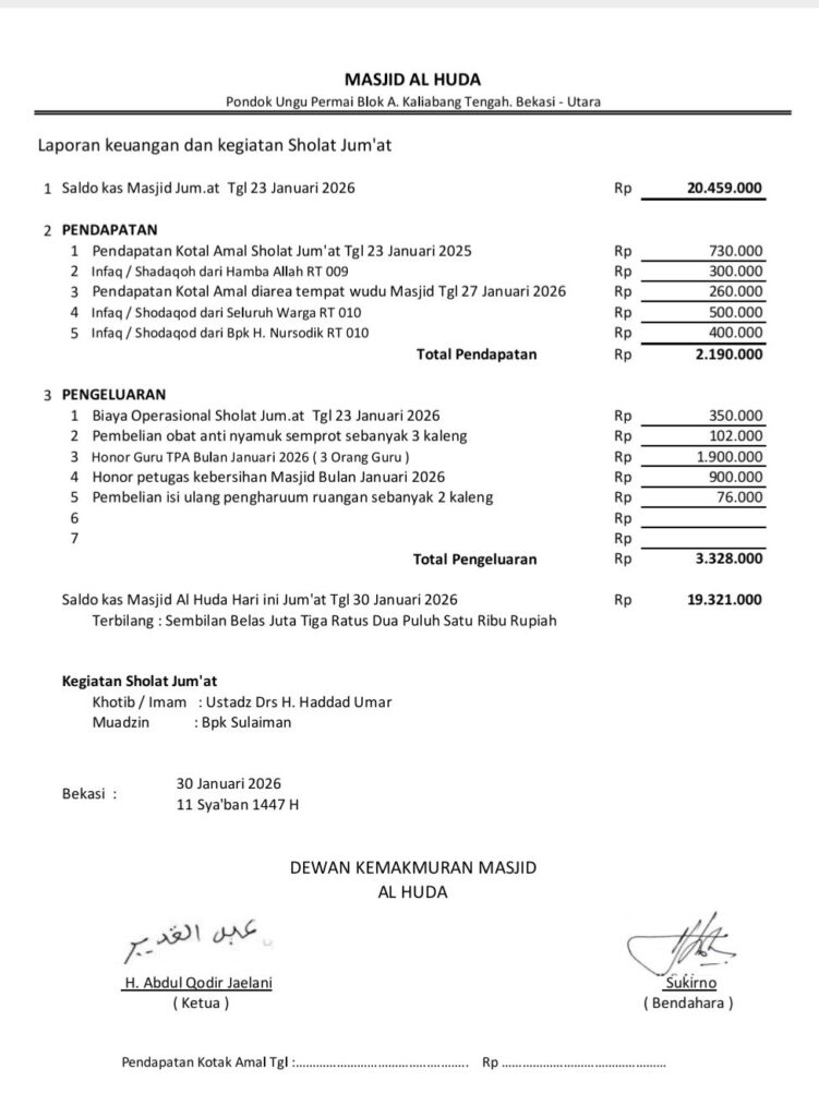 Posted inJum'atan Laporan kas keuangan Jum’at Bulan Januari 2026 Posted by By H Kirno Sukirno Januari 20, 2026 H Kirno Sukirno View All Posts Post navigation Previous Post Laporan kas keuangan Masjid Bulan Desember 2025Next PostLaporan kas keuangan Masjid Bulan Januari 2026