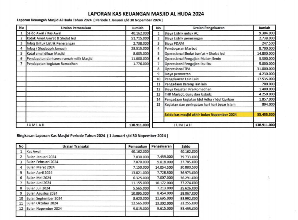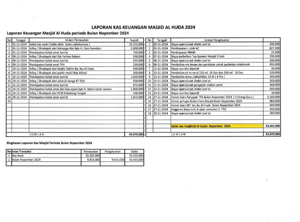 Posted inBulanan Laporan kas keuangan Masjid Bulan Nopember 2024 Posted by By H Kirno Sukirno Desember 9, 2024 H Kirno Sukirno View All Posts Post navigation Previous Post Laporan kas keuangan Masjid Bulan Oktober 2024Next PostLaporan Jum’at Bulan Januari 2024