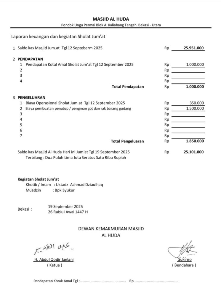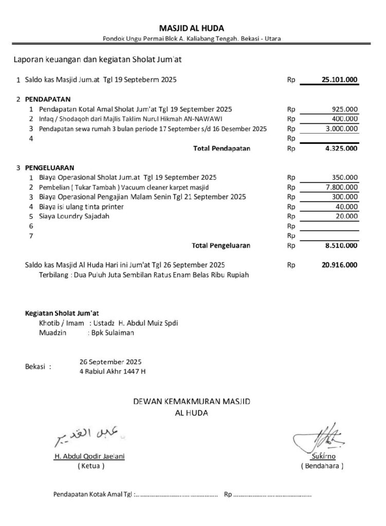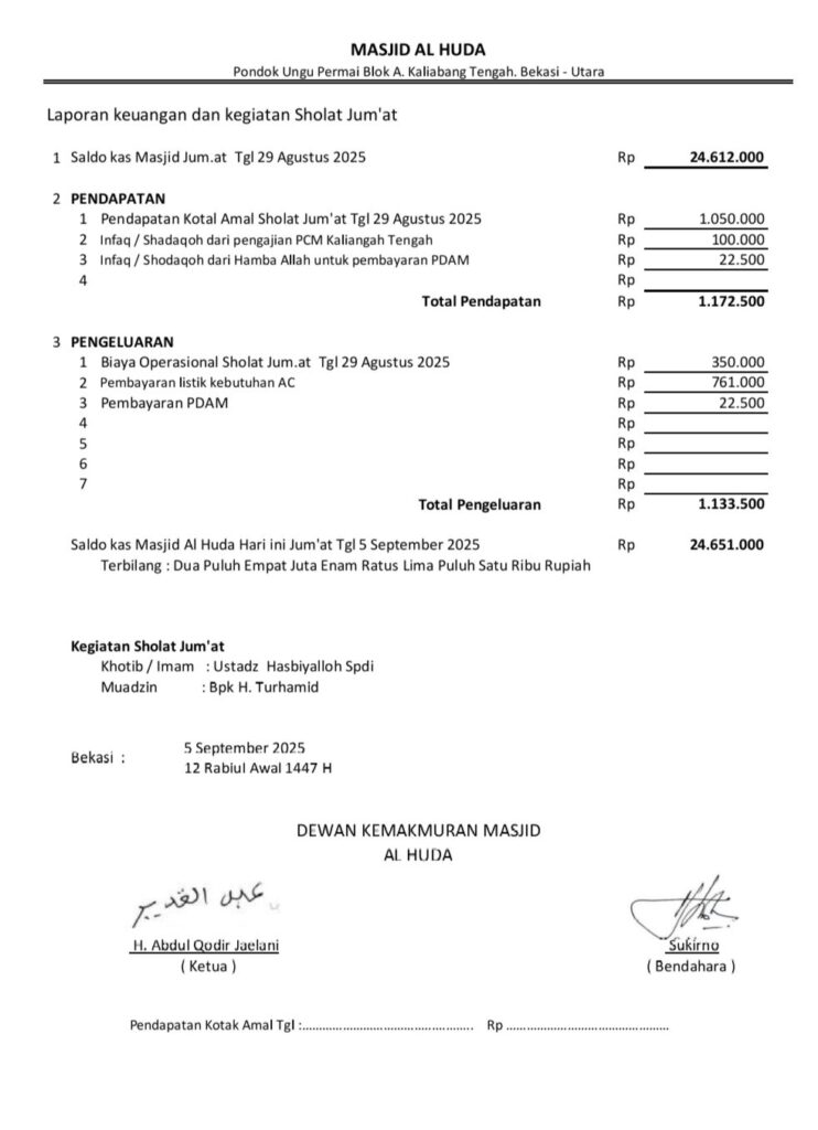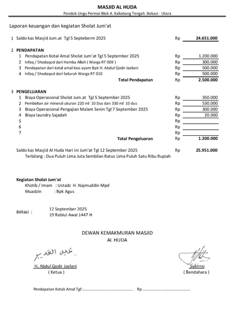 Posted inJum'atan Laporan Keuangan Jum’at Bulan September 2025 Posted by By H Kirno Sukirno September 11, 2025 H Kirno Sukirno View All Posts Post navigation Previous Post Laporan kas keuangan Masjid Bulan Agustus 2025Next PostLaporan Keuangan kas Masjid Bulan September 2025
